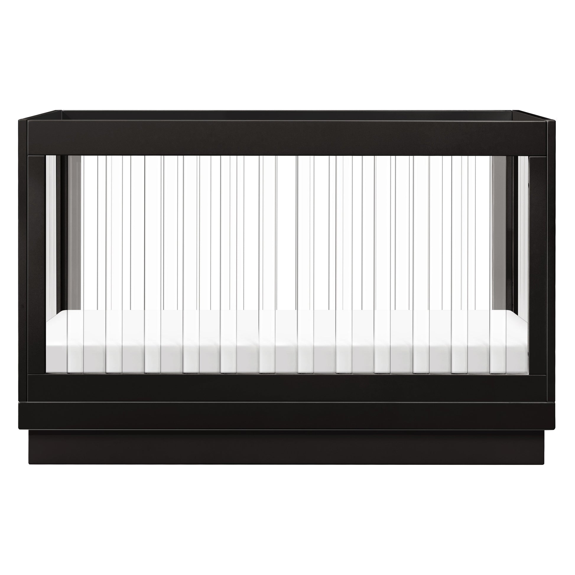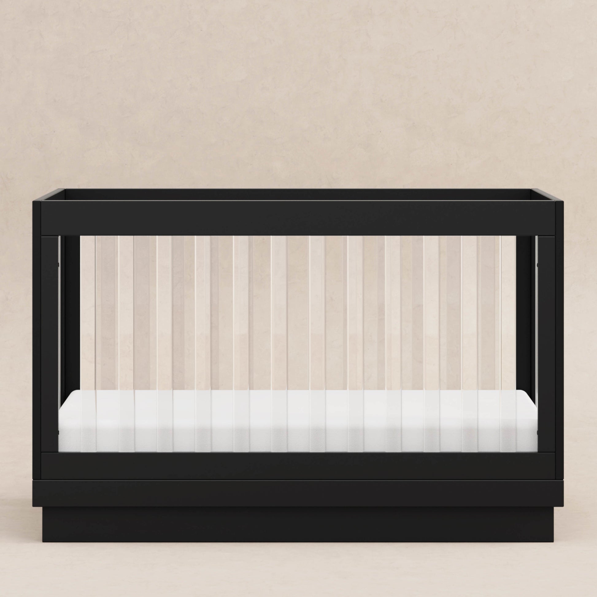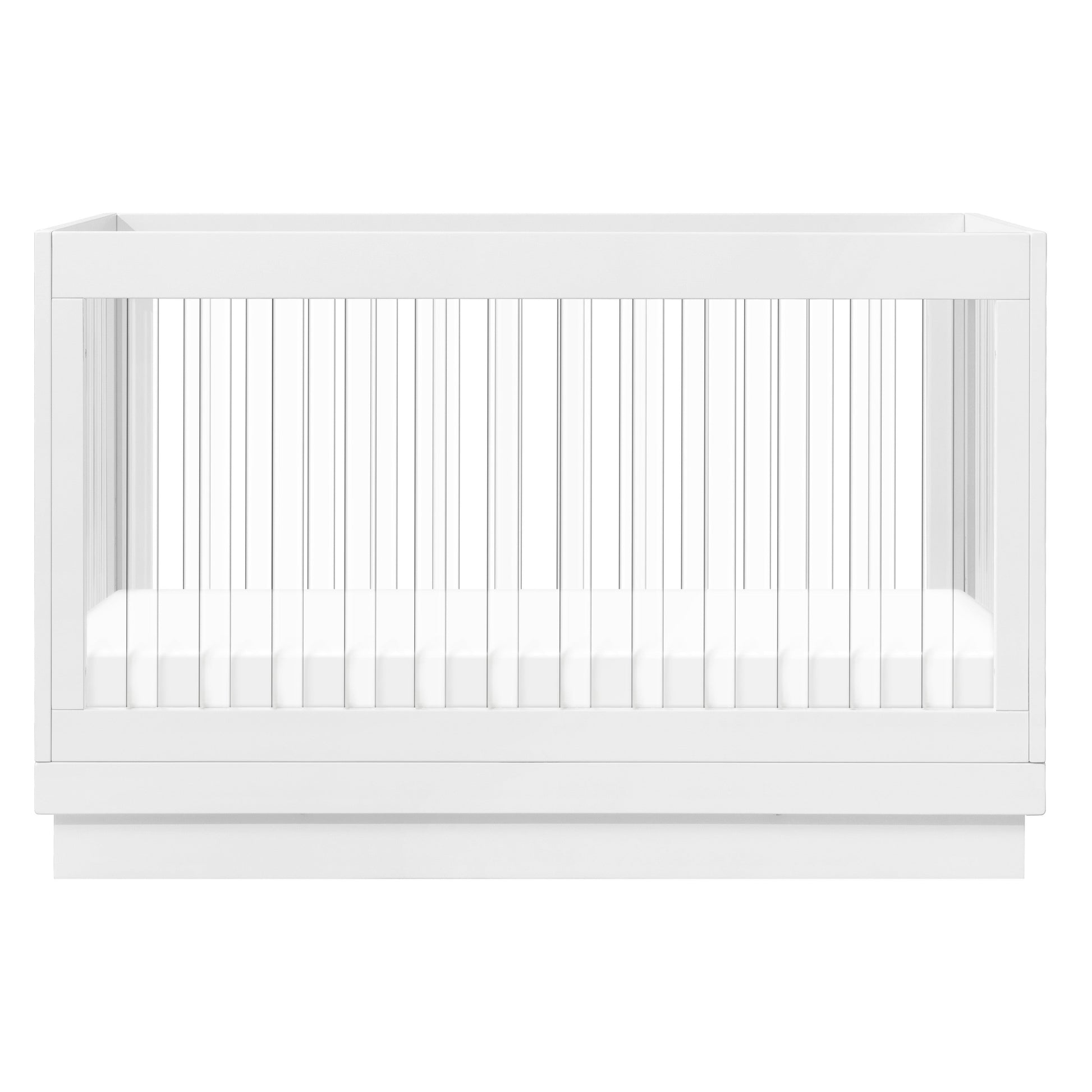- MODERN CLEAR VIEW DESIGN: The chic Harlow crib offers you an unobstructed view of babe with unique acrylic slats on a contrasting solid pine wood platform.