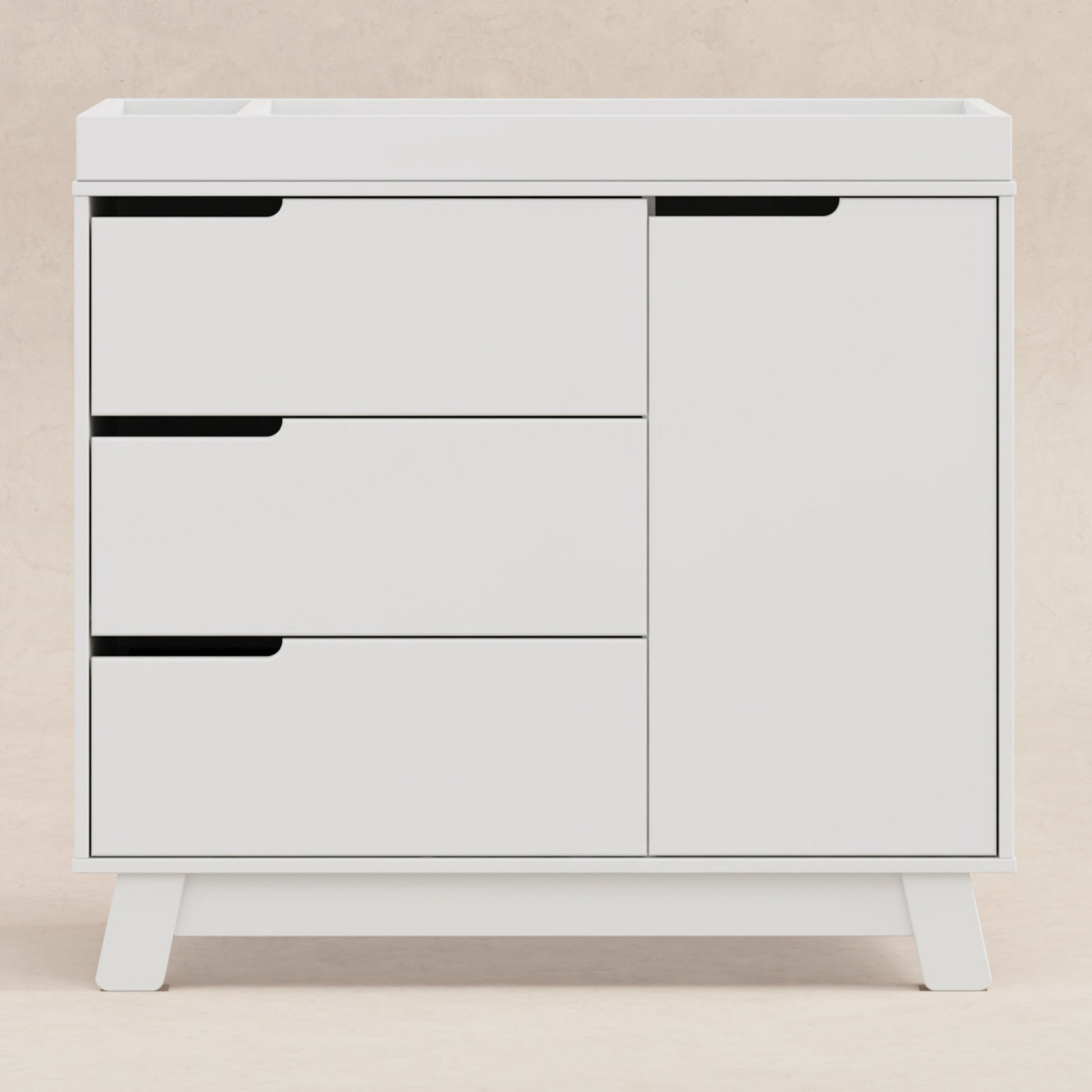 Get more from your nursery furniture with the versatile Hudson Changer Dresser. Combining a changing table, three drawer dresser, and storage cabinet all in one solid and practical package, the Hudson Changer Dresser is a modern space-saving convenience. Complementing the mid-century modern-inspired Hudson 3-in-1 Convertible Crib, the dresser comes in three chic finishes including two new takes on two-tone for the nursery. Truly built for baby, the removable changer tray's raised sides help keep your little one safe, and an anti-tip kit is included for further security. Keep baby's clothes and necessities organized in the smooth-opening drawers, while stop mechanisms prevent them from being pulled all of the way out. The storage cabinet closes gently and includes an adjustable shelf, perfect for keeping diapers and wipes handy.