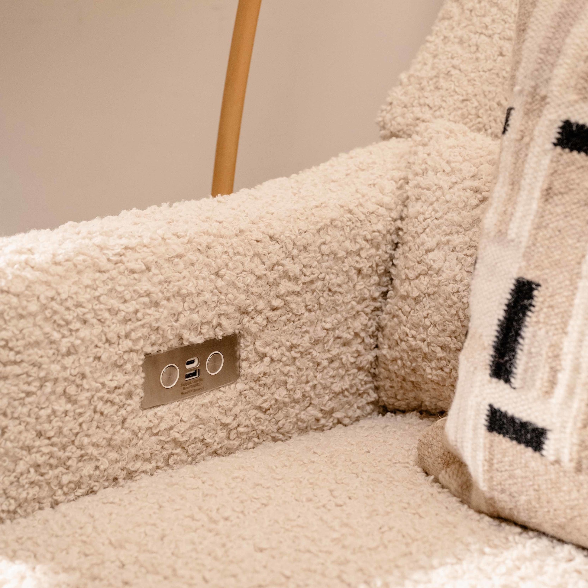 The Kiwi Glider Recliner takes the phrase “rest and recharge” to a whole new level with its built-in USB port, smooth swivel motion, and effortless back and forth gliding motion. Lean back and kick up your feet at the touch of a button with this recliner’s quiet electronic control button. It's a stylish choice with a modern wingback design but also a more sustainable choice for your home. Upholstered by hand in our eco-performance fabric, that is stain resistant, water repellent, and made with at least 30% recycled yarn.