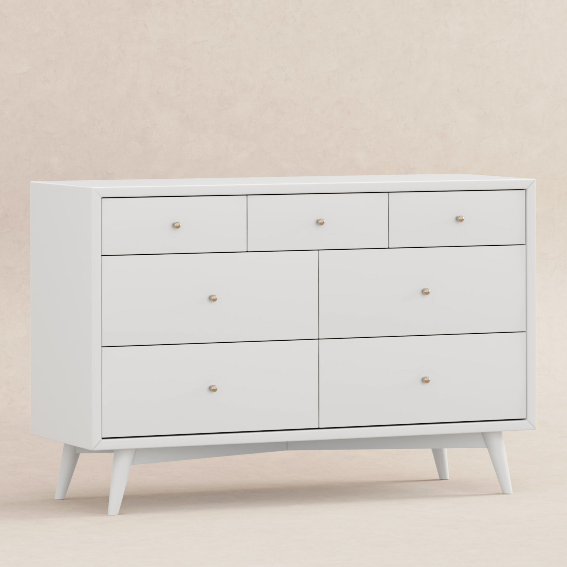 The Palma 7-drawer Double Dresser is a sophisticated mid-century inspired design with contrasting walnut stained drawers, tapered legs, brushed metal hardware, and smooth-glide drawers. It's a versatile modern piece, providing ample storage space with three top drawers and four larger bottom drawers. Pair with the Palma 4-in-1 Crib or Peggy 3-in-1 Crib for an elegant nursery.