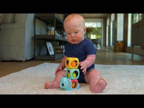 Roll into a happy tactile-learning adventure with the Lamaze Stack Rattle & Roll Blocks. This set of rattling blocks is designed for easy stacking, and features an elephant roller that little ones will love. The Stack Rattle & Roll Blocks encourage fine motor skills, hand-eye coordination, and exploration as little ones stack the cubes onto the elephant roller and onto each other. Each textured cube has a ball inside that rattles, adding another level of fun and discovery. Plus, the weight of the balls aligns the cubes and holds them in place, so there's no more frustration or tears. Just easy stacking that encourages little ones to keep exploring and keep discovering!
