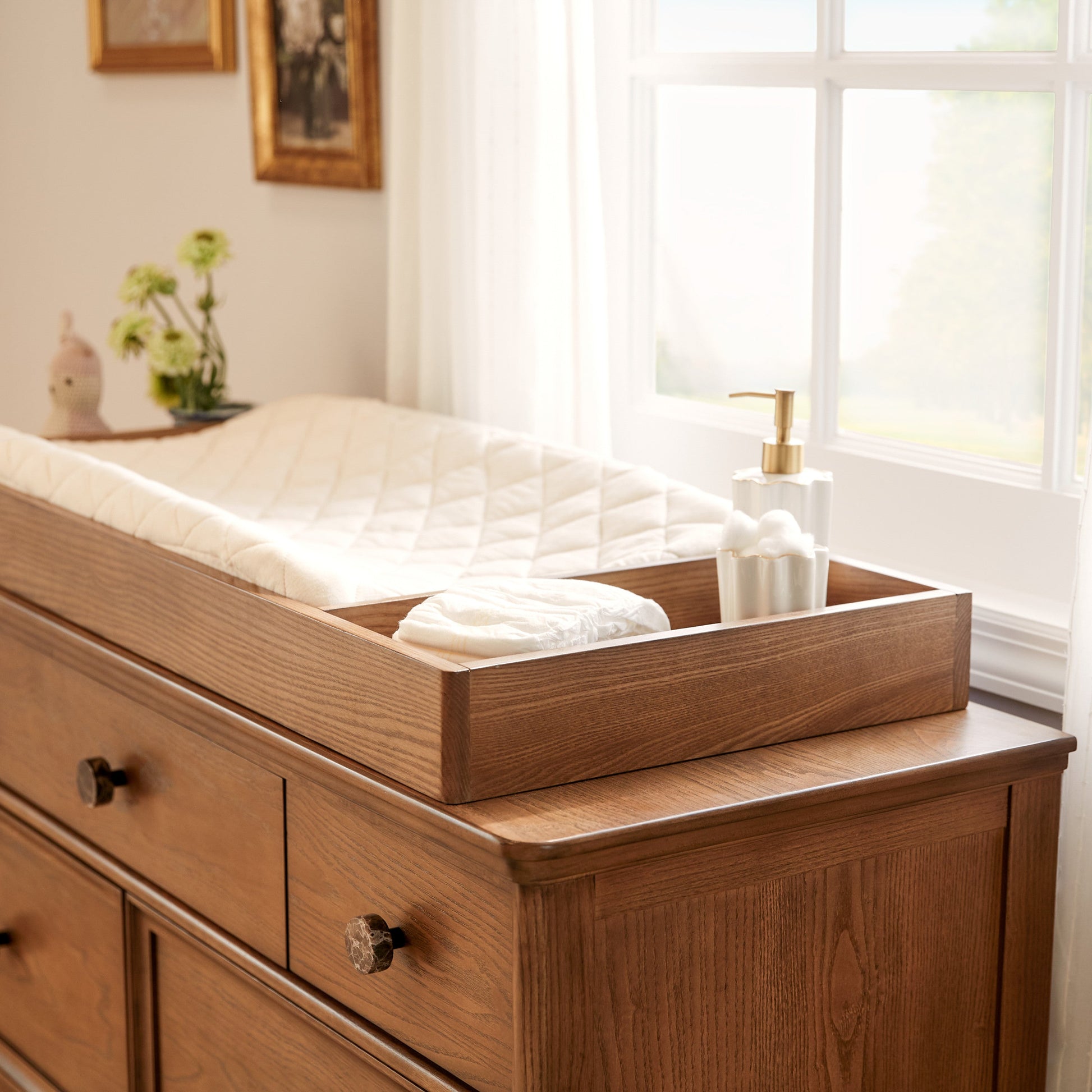 - Features a small compartment for keeping all your diaper changing essentials handy and felt pads to protect the top of the dresser.